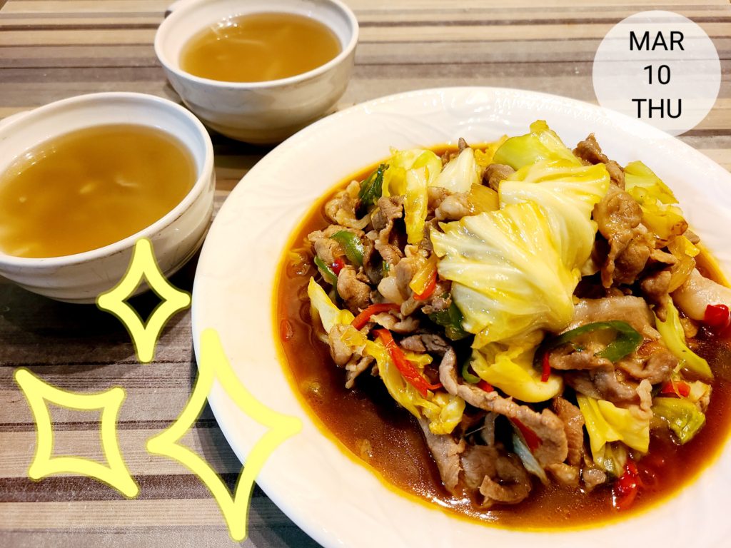 産直豚カタロースの甘辛炒め・3種きのこのスープセット